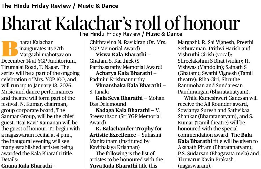 | December (Madras) Chennai Music Season Awards 2025 - 2026 * Bharat Kalachar DR. MRS YGP AWARD FOR CULTURAL EXCELLENCE - Vyjayanthimala Bali (at the birth centenary celebration of educationist Dr. YGP organized by Bharat Kalachar) ![]() * Brahma Gana Sabha Gaana Padhmam - Neyveli S.Santhanagopalan Vaadhya Padhmam - Mannargudi A.Easwaran Naatya Padhmam - Meenakshi Chitharanjan Naataka Padhmam - Mapillai Ganesh * Gayatri Fine Arts and Gayatri Fine Arts Global - Vishwa Sangeetha Seva Visharadha - V.V.Sundaram - Sangeetha Seva Visharadha - Subhasree Thanikachalam * Kartik Fine Arts - NADANAMAMANI - Deepthi Ravichandran (Bharatanatyam) - NRITHYA PEROLI - The Dhananjayans (Bharatanatyam) - ISAI PEROLI - J.A. Jayant (Flute) - NADHASWAROOPAM AWARD - Dr.R.Suryaprakash (Vocal) - NATYA CHUDAR - Sanjena Ramesh (Bharatanatyam) - Nrithyajyothi award of excellence in Bharatanatyam - Aishwarya.B (Bharatanatyam) - Natya Kala Arasi - Bala Devi Chandrashekar (Bharatanatyam) - Madurai Krishnan Memorial Honour 'Madura Kalamani' - V.Balagurunathan (Bharatanatyam) - Shri K.M. Narasimhan award - Parur M.K.Ananthalakshmi (dance accompanist, Violinist) - Kartik promising artiste award - P.Lekha, Sahana Selvaganesh, N.RM. Abirami, Saipriya Senthilvasan, Smrithi Vishwanath - Kartik Rajagopal Endowment Award for Best Cultural Organiser - G.Nagarajan (Sec., Chrompet Cultural Academy) ![]() * Lakshminarayana Global Music Festival Lakshminarayana International Award - A.R.Rahman * Mudhra ![]() * Nada Sudha - Nada Vallabha award - V.Rajkumar Bharathi (Vocal), T.V.Ramanujacharlu (Violin), Trichur C.Narendran (mridangam), D.Balakrishna (Venna) - Meritorius Service in Fine arts award - Mudhraa Bhaskar and Radha Bhaskar - Nada Pallava awards to young talented artists * Sri Krishna Gana Sabha SANGEETHA CHOODAMANI - K.V.Prasad (Mridangam) NRITHYA CHOODAMANI - G Narendra (Bharatanatyam) * Sri Parthasarathy Swami Sabha ![]() ![]() SANGEETHA KALASARATHY - Prof. V.V. SUBRAHMANYAM (Violin Maestro), VISHAKHA HARI ( Harikatha Exponent) Lifetime contribution ACHARYA SARATHY - RAMA RAVI, Dr. R. K. PADMANABHA Palghat Mani Iyer Centenary Award - T.G. MUTHUKUMARASAMY (Thavil) Dwaram Venkataswami Naidu Award - V.V.S. MURARI Gottuvadyam Narayana Iyengar Award for Musical Excellence - NIRMALA RAJASEKAR Veena Pichumani Iyer Centenary Award - Mudikondan S. N. RAMESH Kalpagam Swaminathan Award - MANGALAM SHANKAR Pudukkottai Dakshinamurthy Pillai Award - M. MANOJ SIVA (Mrudangam), B. GANAPATHY RAMAN (Mrudangam) Isai Methai G. Ramanathan Award - VIDYA KALYANARAMAN Dr. M.L. Vasanthakumari Award - SHRUTHI SHANKAR KUMAR * Sri Thyaga Brahma Gana Sabha ![]() * Tamil Isai Sangam Isaiperaringnar - Chitra Visweswaran (Bharatanatyam) Pann Isaiperaringnar - Kudandhai V.Lakshmanan * The Music Academy Sangita Kalanidhi - R.K.Shriramkumar (Violin) Nritya Kalanidhi - Urmila Satyanarayana (Bharatanatyam) Sangita Kala Acharya - Shyamala Venkateswaran (Vocal), Thanjavur R.Govindarajan (Tavil) TTK award - Madambi Subramania Namboothri (Kathakali Music), J.T.Jeyaraaj Krishnan and Jaysri Jeyaraaj Krishnan (Veena) Musicologist award - Prof. C.A.Sridhara Details |