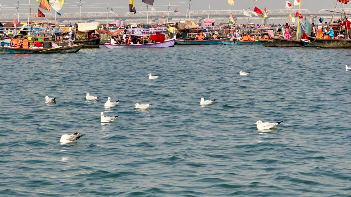 Reached Triveni Sangam and immediately were mobbed by boatmen quoting exorbitant amounts to take us to the confluence in the middle of the river. After much haggling hired a boat, watched the confluence of Ganga and Yamuna. Ganga was yellowish and gurgling wildly past the calm and quiet bluish Yamuna. Saraswati was invisibly present there. Loads of migratory Siberian gulls were flying around squawking.